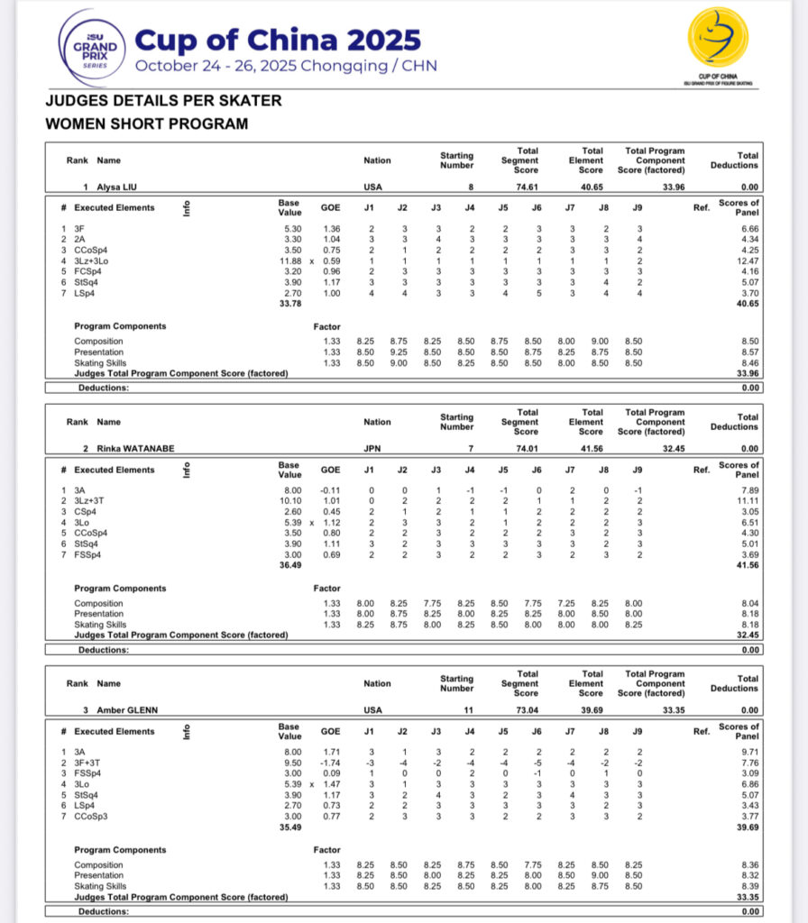 構成に3Aを組み込んでいる、中井亜美選手、渡辺倫果選手、アンバー・グレン選手のベースバリューは、必然的に高いのが分かりますね🤔