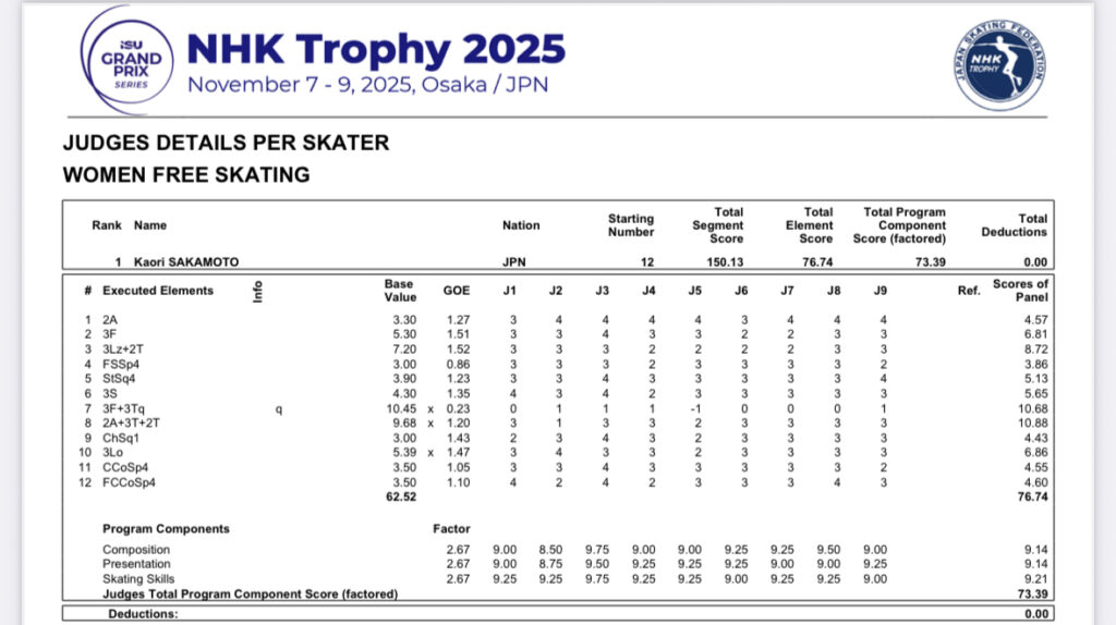 では、得点を見てみると、坂本選手の150.13点が、いろいろな意味で際立っているような😓